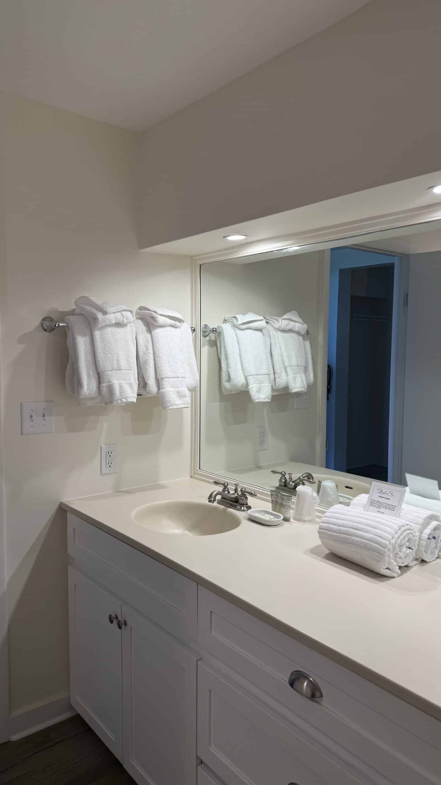 The over-sized bathroom features two sinks, tub and shower.